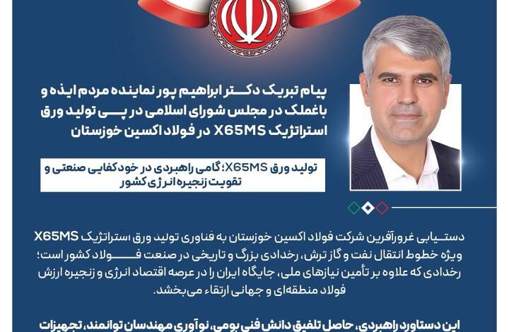 اینجانب، به نمایندگی از مردم شریف و همیشه سربلند ایذه و باغملک مردم سرافراز استان خوزستان این موفقیت علمی، صنعتی و ملی را به مدیران، متخصصان و کارگران پرتوان فولاد اکسین خوزستان تبریک عرض میکنم و یقین دارم که استمرار این مسیر، ایران عزیزمان را در جایگاهی بالاتر از تحریمها و محدودیتها خواهد نشاند.