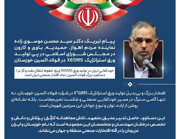 اینجانب، به نمایندگی از مردم شریف و همیشه سرافراز اهواز، حمیدیه، باوی و کارون، این موفقیت درخشان را به خانواده بزرگ فولاد اکسین خوزستان تبریک عرض میکنم و اطمینان دارم که این راه روشن، نویدبخش فتحهای بزرگتر در عرصه اقتصاد و صنعت کشور خواهد بود.