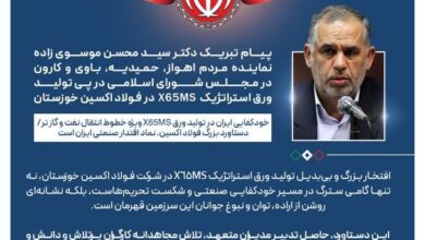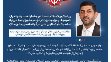 پیام تبریک دکتر سید محسن موسوی زاده نماینده مردم اهواز، حمیدیه، باوی و کارون در مجلس شورای اسلامی در پی تولید ورق استراتژیک X65MS در فولاد اکسین خوزستان